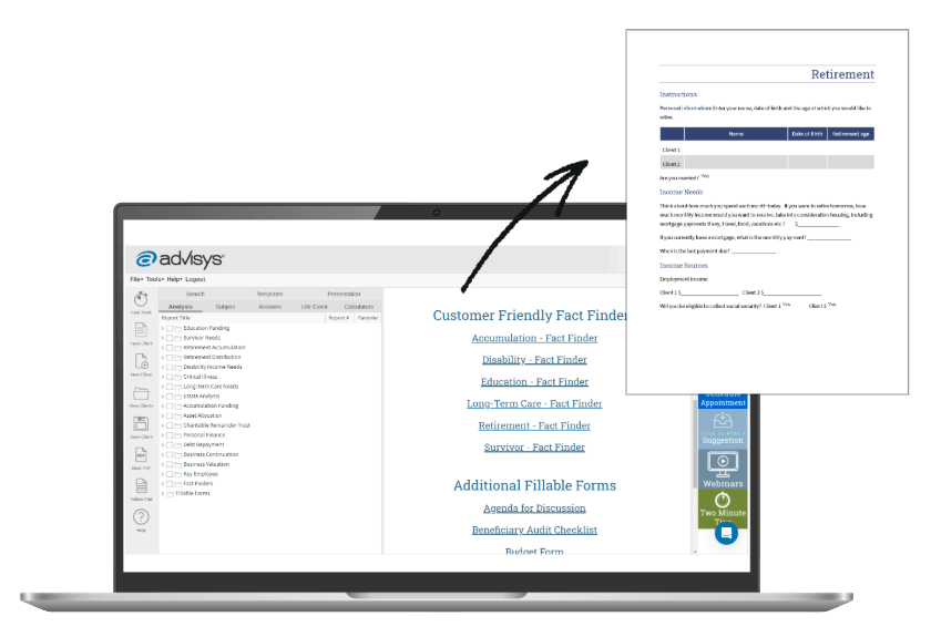 Select from 15 areas of need to build a custom fact-finder that gathers only what's relevant to the client conversation